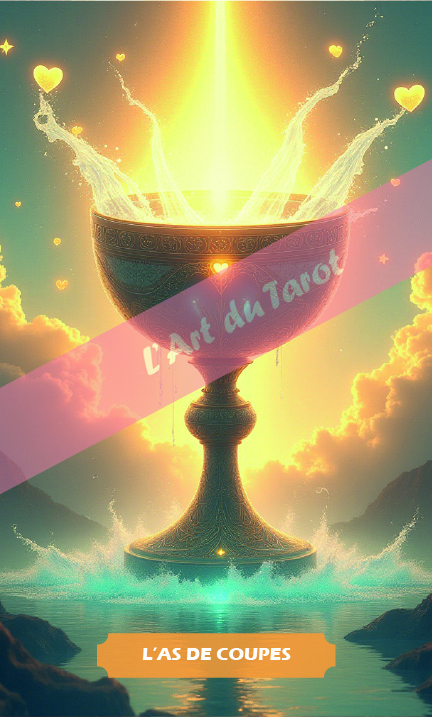 L'As de Coupe symbolise un nouveau départ émotionnel ou spirituel. Cette carte est souvent associée à l'amour, à l'inspiration, et à l'ouverture du cœur. Elle représente la possibilité de nouvelles relations, d'une croissance intérieure ou d'une guérison profonde. L'As de Coupe est un signe de pureté émotionnelle et de potentiel spirituel, offrant une promesse de bonheur et d'accompli