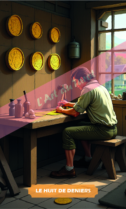 Réflexion : Le Huit de Deniers vous rappelle l’importance du travail méticuleux et de la pratique dans la réalisation de vos objectifs. Réfléchissez à la façon dont vous appliquez vos compétences et comment vous pouvez améliorer encore vos méthodes pour atteindre l’excellence.