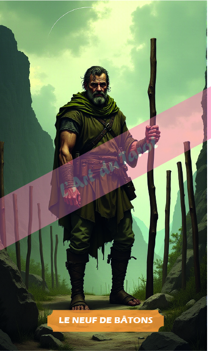 Le Neuf de Bâtons symbolise la résilience, la persévérance et la protection après une période de lutte ou de défis. Cette carte indique que vous avez traversé des épreuves et que vous êtes maintenant en position de défendre vos réalisations et de protéger vos ressources. Le Neuf de Bâtons représente une période où la prudence et la vigilance sont nécessaires, même si vous avez déjà fait beaucoup de progrès.