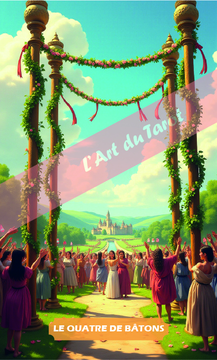Le Quatre de Bâtons vous encourage à savourer les moments de réussite et à partager votre bonheur avec ceux qui vous entourent. C’est une invitation à reconnaître les fondations solides que vous avez établies et à célébrer les petites et grandes victoires dans votre vie.