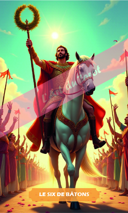 Le Six de Bâtons est une carte de victoire, de reconnaissance et de succès. Elle symbolise un moment où vous recevez l’approbation et la reconnaissance pour vos efforts et vos réalisations. Cette carte indique que vous êtes en train de récolter les fruits de votre travail acharné et que vos efforts sont appréciés par les autres. Le Six de Bâtons représente également la joie collective et le triomphe partagé avec ceux qui ont soutenu votre voyage.